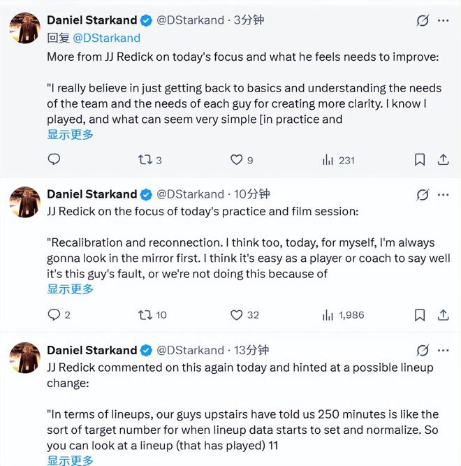 雷迪克还暗示球队会对阵容进行调整。“关于阵容安排,我们的数据部门告诉我们,250分钟左右是阵容数据趋于稳定和正常化的一个基准时长。所以,你不能只盯着一套只打了11分钟的阵容说‘哇,这11分钟打得真好!’。没错,我们确实在一场比赛中使用了小个阵容,而且那场比赛的效果不错,但我们不能仅凭这一点就下结论。不过,我们确实一直在关注一些阵容的表现趋势,并且已经就接下来的阵容调整方向做出了一些决定。”
