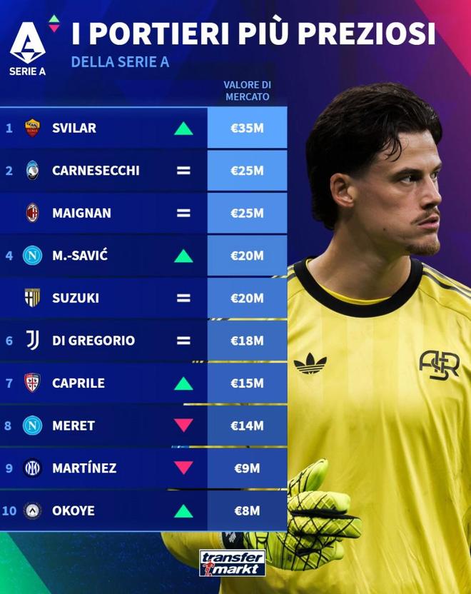 北京时间12月25日,在更新了意甲球员的身价之后,德转列出了此次更新后意甲门将身价前10,罗马的斯维拉尔以3500万欧元高居第一,卡尔内塞基和迈尼昂同以2500万欧元并列第二。