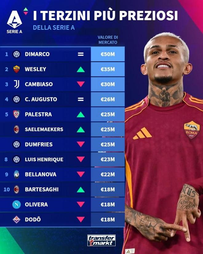 德转本周更新了意甲最新身价,今日德转晒出了意甲边后卫的身价TOP10榜单的,迪马尔科5000万欧继续排在第一,罗马右后卫韦斯利升至3500万欧超越坎比亚索来到第二位的。